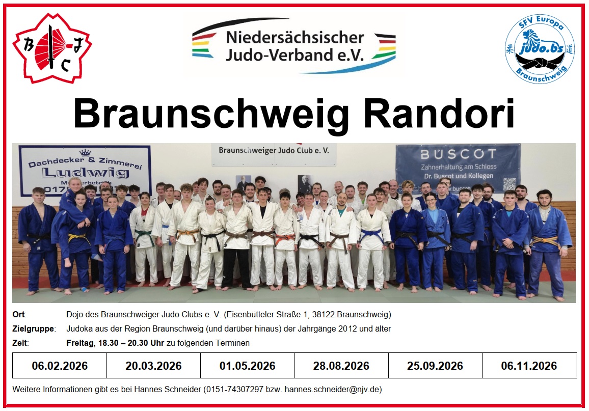 Beim Braunschweig Randori handelt es sich um ein von SFV und BJC initiiertes Trainingsformat für wettkampforientierte Judoka ab Jahrgang 2012 und älter. In intensiven zweistündigen Randori-Einheiten („Wettkampf-Simulation“) trainieren weibliche und männliche Judoka aus Vereinen aus ganz Niedersachsen gemeinsam im Dojo des BJC. 2025 war bereits das dritte Jahr in Folge, in dem das BS-Randori erfolgreich durchgeführt wurde und großen Anklang fand.