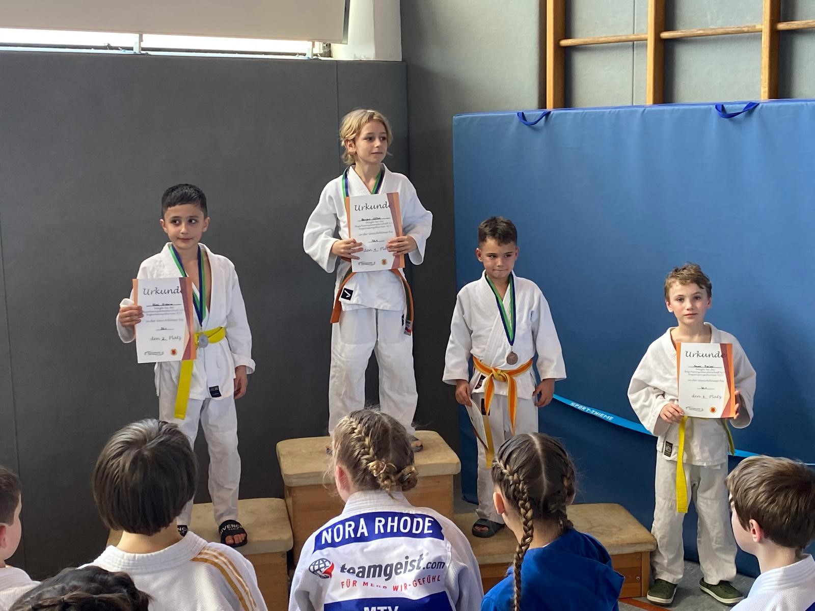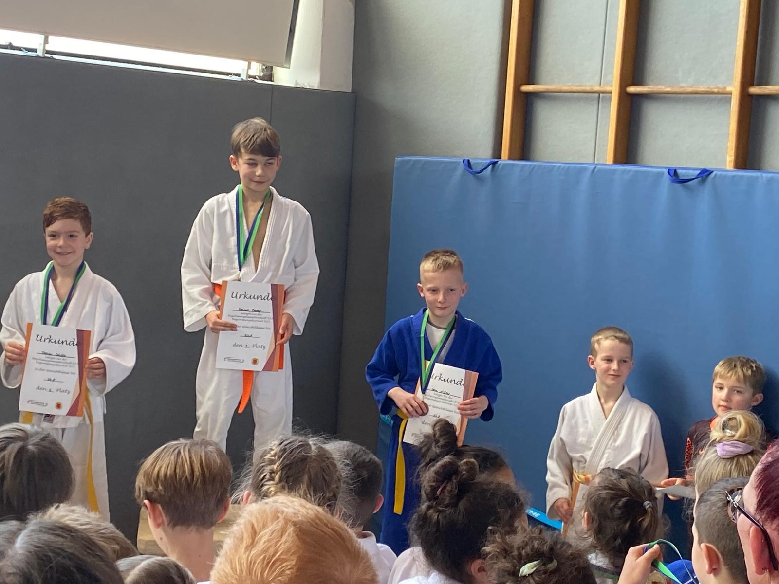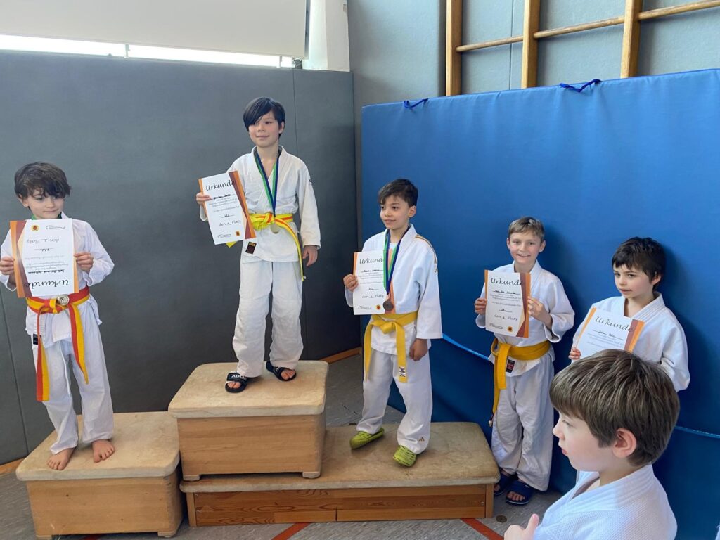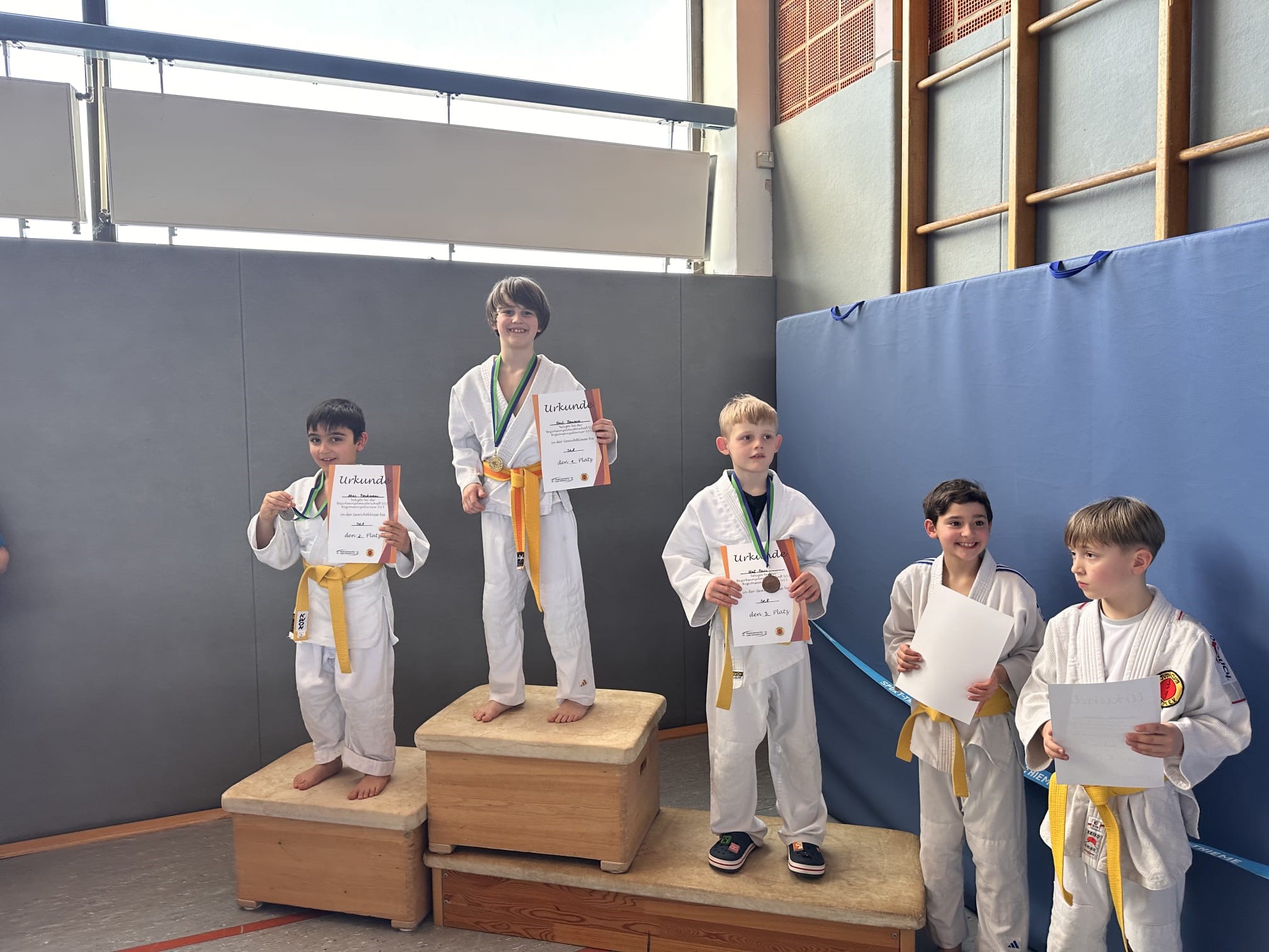 Weiter ging es mit Theo, Lenn und Emil, bei denen sich die Kämpfe leider über einen größeren Zeitraum gestreckt haben. Nichtsdestotrotz konnten alle ihren Einstieg gewinnen, für Emil ging es dann auch genauso weiter. Er ging aus all seinen restlichen drei Kämpfen ebenfalls als Sieger hervor und sicherte sich die Goldmedaille. Lenn hatte ebenfalls noch drei Kämpfe, die bei ihm mit vielen Führungswechseln und viel Spannung einhergingen. Am Ende ging er noch aus einem weiteren Kampf siegreich hervor, in den anderen zwei musste er sich leider geschlagen geben, was für ihn am Ende Platz 3 bedeutete. Bei Theo blieb es leider bei dem einen gewonnenen Kampf, sodass es für ihn beim 4. Platz blieb.