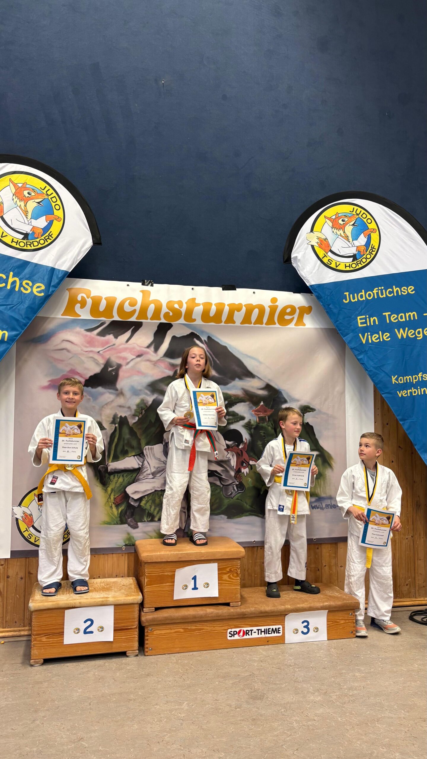 Weiter ging es mit den männlichen Judoka der Altersklasse U13. Für den SFV Europa gingen Theo Ole Schulz, Henrik Hoppe, Stefan Rieger und Anton Melzig an den Start. Theo trat selbstbewusst auf und überzeugte mit großem Kampfgeist. Zwei Kämpfe konnte er für sich entscheiden, lediglich gegen einen deutlich älteren Gegner musste er sich geschlagen geben – am Ende bedeutete das einen starken zweiten Platz.